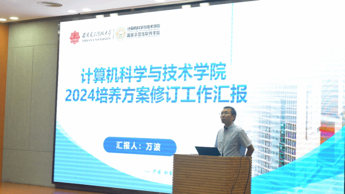 副院长万波汇报了学院本科人才培养方案修订工作,他谈到,在本科教学研讨月活动开展了10余场人才培养研讨凝聚全院共识,通过高校调研、企业同行专家研讨、校友及学生代表研讨等分析了当前培养方案存在的问题,提出了修订总体思路,并汇报了修订后的计算机科学与技术和软件工程专业培养方案的基本情况、课程模块、课程分布及变化等情况,对后续培养方案落实中涉及的课程建设、教材建设、团队建设和AI赋能进行了说明。他希望更多的老师积极投入到学院课程建设和课程教学改革中,共同提高教学质量和人才培养质量。