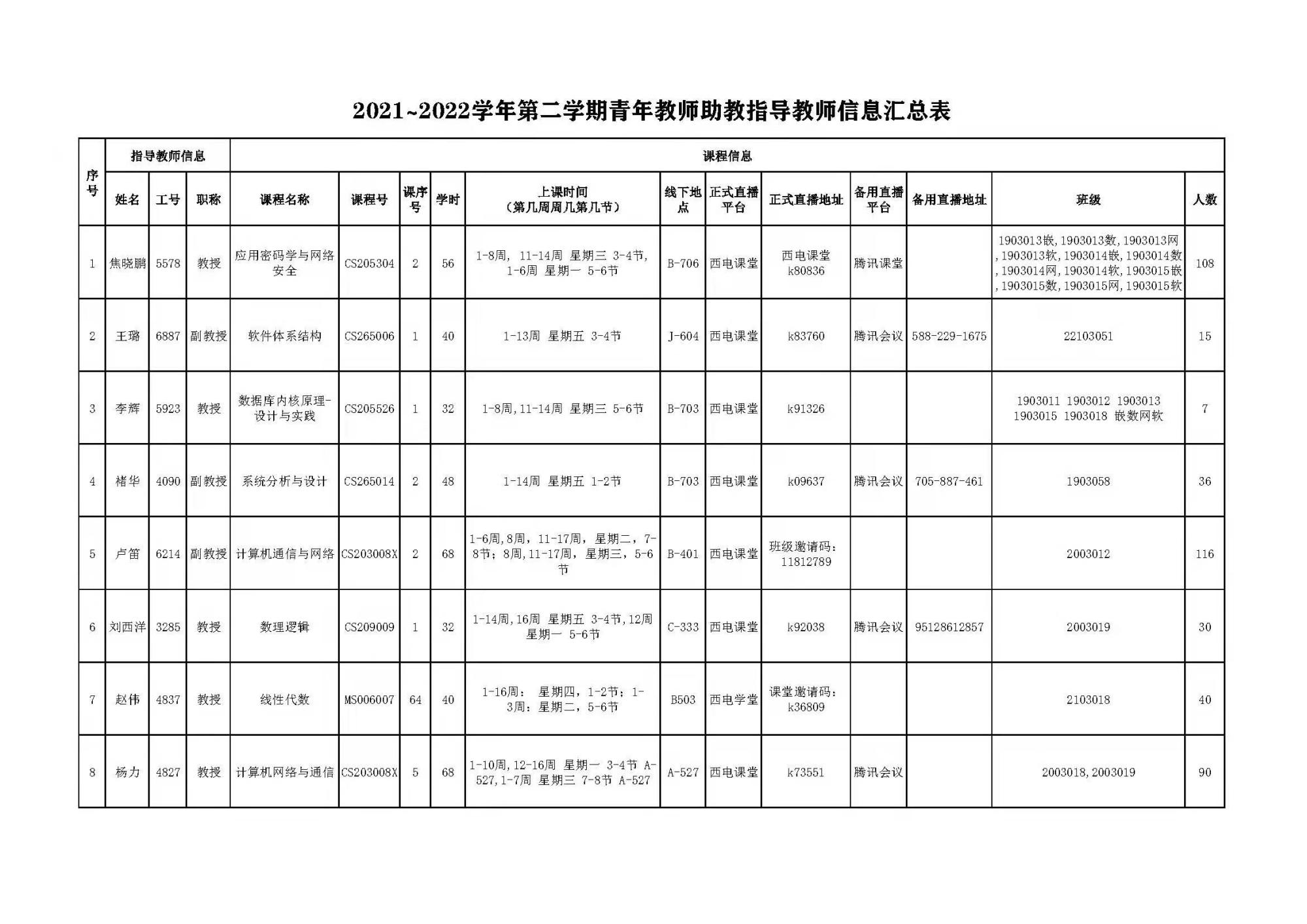 2021~2022学年第二学期青年教师助教指导教师信息汇总表