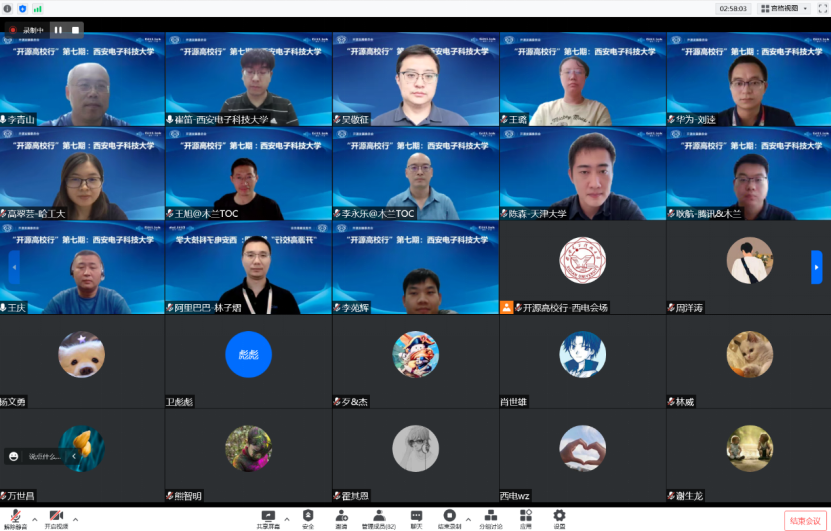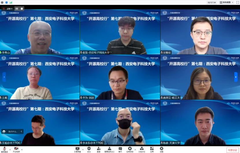 活动最后,王庆老师、耿航老师、王旭老师、李永乐老师进行了圆桌讨论,就“高校学生如何参与开源?”、“公司需要什么样的开源人才?”、“国内目前开源就业氛围如何?”、“高校目前内部开源教育氛围如何?”等关键问题展开讨论。四位专家与西电师生通过线上提问进行持续交流,互动交流环节气氛热烈。