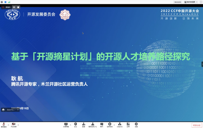 耿航老师的报告《腾讯开源摘星计划培养开源贡献者的实践思考》以腾讯开源摘星计划为例,强调随着开源生态在国内的飞速发展,在高校推进开源教育、建立产学研一体化开源创新人才培养体系的重要性。面向高校和开发者人群,加强开源文化和开源技能培养,将“开源”的生态能力放大,充分培养后备力量,是社会和企业的重要课题。该报告重点分享了腾讯在开源生态建设层面的整体理念、开源人才培养的实践路径。