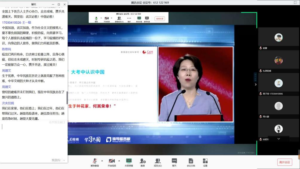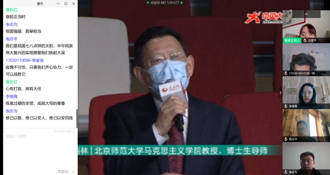 本科17级计算机科学与技术专业0108班班长史越超通过腾讯课堂组织了主题班会,全班62名同学在线上的“云”相聚,共同观看思政课。在班长的组织下,同学们结合课程学习内容对党中央关于疫情防控的决策部署、身边防疫抗疫一线的感人故事等展开了讨论。班长史越超表示:“通过本次班会学习,同学们明确了作为大学生在这场疫情中的责任与担当,表示要身体力行,积极参与到防疫抗疫中,相信在不久后我们一定能取得战斗的胜利!”