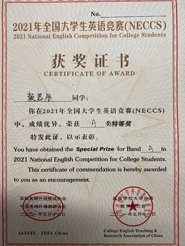 (通讯员 何敏之)5月16日,经过激烈的角逐,在2021年全国大学生英语竞赛(NECCS)陕西赛区复赛中,kaiyun登录中国入口登录2020级硕士研究生颜思彤脱颖而出,斩获A类特等奖,她也是全校唯一在复赛中取得A类特等奖的研究生。此外,全校共有九位同学获得该竞赛陕西赛区特等奖的优异成绩。