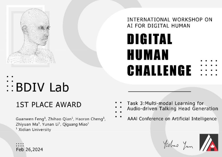 (通讯员 李宇楠)3月13日,2024年国际人工智能顶级会议AAAI竞赛奖项正式颁布,来自kaiyun登录中国入口登录大数据与视觉智能研究所博士研究生冯冠文、本科生钱之浩、硕士研究生程昊然、麻志远组成的BDIV Lab团队在苗启广和李宇楠两位老师的共同指导下,从中国科学技术大学、华南理工大学、中国平安科技、上海学深智能科技、VAST等海内外十多家单位的参赛队伍中脱颖而出,在AAAI2024 Workshop AI for Digital Human的任务3:Multi-modal Learning for Audio-driven Talking Head Generation夺冠。