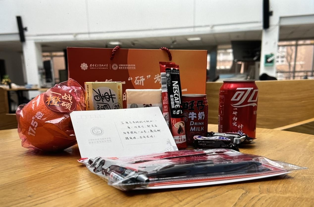 为给考研学子们提供关怀与支持,学院组织开展“研途有你,加油包送心意”活动,特准备了含有一战“橙”硕—脐橙、诸事顺“愿”—薯愿、“士”气加倍—士力架、好运“旺旺”—旺仔牛奶、学院师生手写祝福明信片等物品的“暖心加油包”。