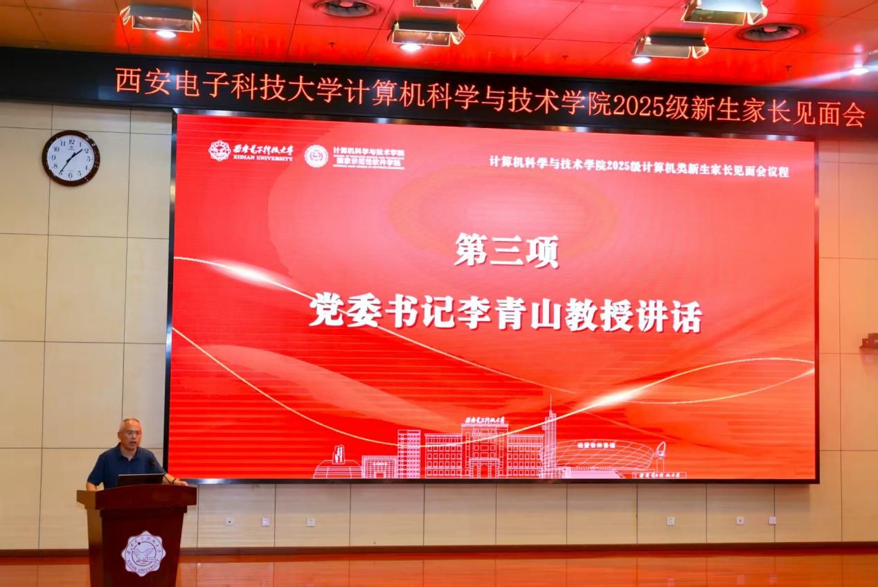 最后,学院党委书记李青山教授做总结讲话。他首先对到场的新生家长表示热烈欢迎,并就大家选择西电、选择计科院相关专业表示感谢。随后,他结合学院雄厚的学科实力与优渥的教学科研环境,强调学院作为“命根子系”“刀把子系”传承凝练出了十六字“三系精神”与八字院训,在专业培养与品格塑造方面发挥了优秀的“传帮带”作用。他殷切寄语各位新生尽早完成从高中生到大学生的身份认知和角色转变,独立自主克服生活与学业中的各项困难,在学有余力的前提下主动参与到学院相关研究所的科研实践中去,拓宽视野练就本领。同时,希望各位家长充分发挥家校育人合力,共同帮助学生成长为德才兼备、身心健康的国家栋梁。
