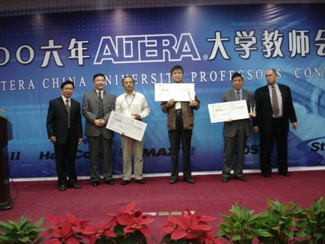 相飞、宁文博和朱伟同学不但获陕西一等奖及第一名——Altera杯,而且还一举夺得全国二等奖,该队指导老师郭万有教授获得“Altera卓越导师奖”,他们的作品“实时视频处理机顶盒”针对模拟电视与数字电视不兼容的问题提出了一种新的解决方案,该方案将FPGA信号处理技术和NiosII多核处理器技术相结合,实现了视频转换、图像显示、音乐播放和菜单显示等功能,具有成本低廉、可靠性高、稳定性好、实时性强、易于升级等特点,充分体现了Nios处理器的优势,赢得了一致好评。