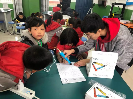 志愿者指导小学生们使用3D打印笔