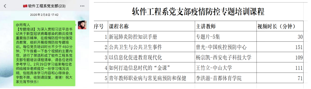 第一阶段,按照学校党委工作部署和学院党委理论中心组学习内容,宋胜利带领大家集体学习了习近平总书记指挥部署战“疫”的系列重要讲话精神,重点学习了习近平总书记在统筹推进新冠肺炎疫情防控和经济社会发展工作部署会议上的讲话精神,习近平总书记对新冠肺炎疫情的防控形势进行了科学分析,部署了下一步疫情防控和经济社会发展的各项重点任务和重点举措。按照学校党委部署,软件工程系党支部制定了疫情防控专题培训方案,制定了党员疫情防控专题培训课程列表,通过专题学习提升教师党员的疫情防控工作能力和水平。