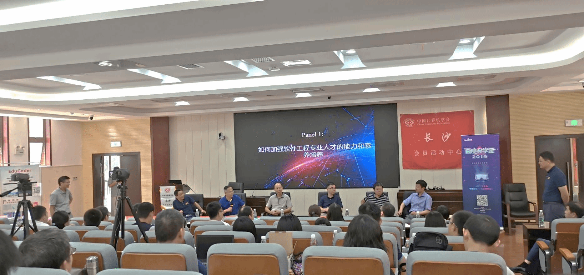 在Panel交流环节,关于“如何加强软件工程专业人才的能力和素养的培养”这一议题,李宣东教授、应时教授、魏峻教授、李青山教授、刘宏教授、毛晓光教授等六位专家就软件工程教学过程中知识的重要性、实践教学的困难和问题及解决办法、软件工程教学平台和实践环节考核等进行了深入交流,表达了各自的观点和思路,在激烈的思维观点碰撞中进一步加深认识和理解,精彩的Panel交流获得了大家的积极响应和热烈掌声。