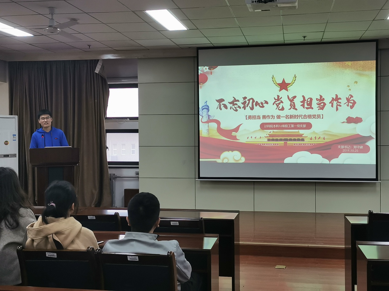 (通讯员 曹佳妮)习近平总书记在十九大报告中指出,要在全党开展 “不忘初心、牢记使命”主题教育活动,用党的创新理论武装头脑,推动全党更加自觉地为实现新时代党的历史使命不懈奋斗。中共中央决定从6月开始,在全党自上而下分两批开展“不忘初心、牢记使命”主题教育活动。10月25日下午五点,kaiyun登录中国入口登录本科2016级软件工程第一党支部在G楼516开展“不忘初心、牢记使命”主题教育党课活动。活动由支部书记郑守建主持。