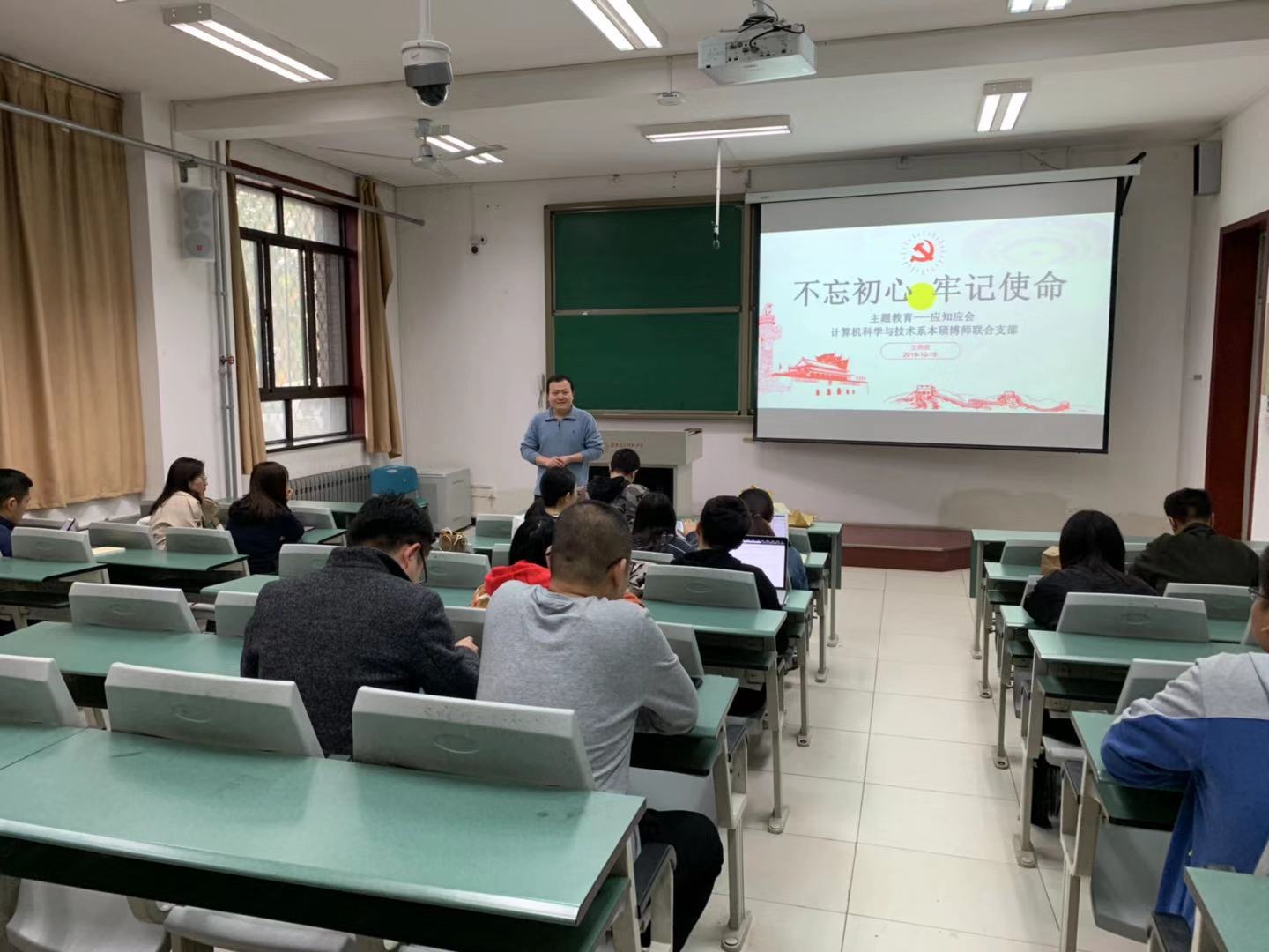 (通讯员 胡洁)为深入学习贯彻习近平新时代中国特色社会主义思想,扎实开展“不忘初心、牢记使命”主题教育,2019年10月18日下午,计科院计算机科学系本硕博师联合党支部在北校区西大楼105教室召开了“不忘初心、牢记使命”主题教育大会。主题教育是党员思想政治建设的重要形式,围绕一个主题,深入展开思想教育,用党中央的要求武装头脑,以进一步统一思想、提高认识、增强作为。会议由党支部书记王炳波主持。