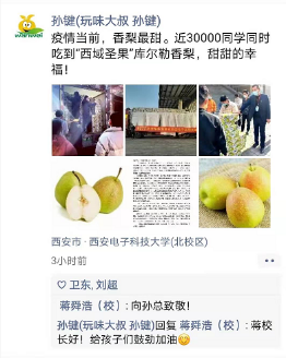 (通讯员 陈龙)当前西安疫情形势有所好转,正在朝着更加积极的方向发展,新年伊始西电计科院93级院友孙键企业陕西玩味电子商务有限公司向学校捐赠了1000箱库尔勒香梨,目前该捐赠物资已经顺利发放,全部送到了广大学生手中。