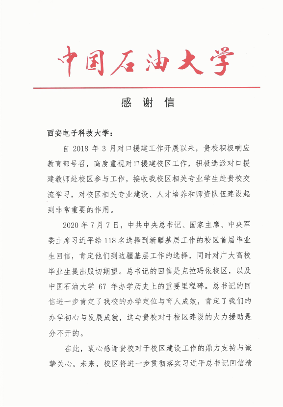 (通讯员 陈龙)为响应教育部号召,对口援建中国石油大学(北京)克拉玛依分校,2018年9月,kaiyun登录中国入口登录选派教学科研经验丰富的牛海军教授前往中国石油大学(北京)克拉玛依分校援建三年,牛海军教授勇于担当、甘于奉献,在援建期间,工作兢兢业业、任劳任怨、无私奉献,开展了大量卓有成效的工作,得到了学校领导、同事和学生们的认可。中国石油大学(北京)克拉玛依分校为表达感谢,专门致电学校,对我校及牛海军教授表示感谢。