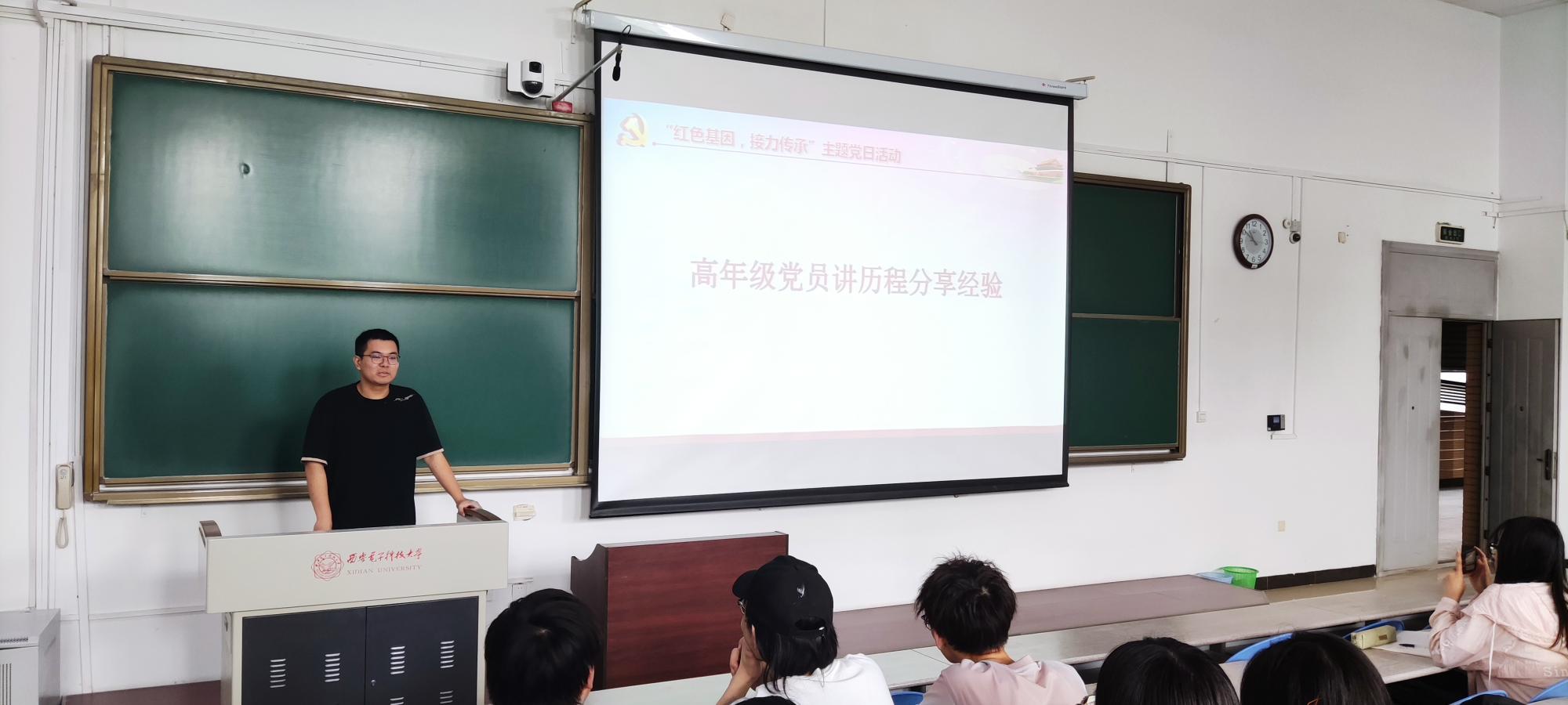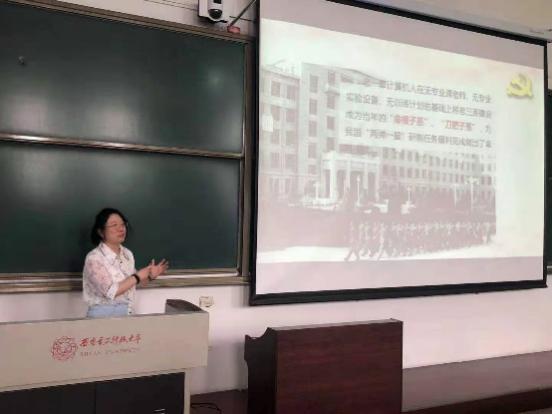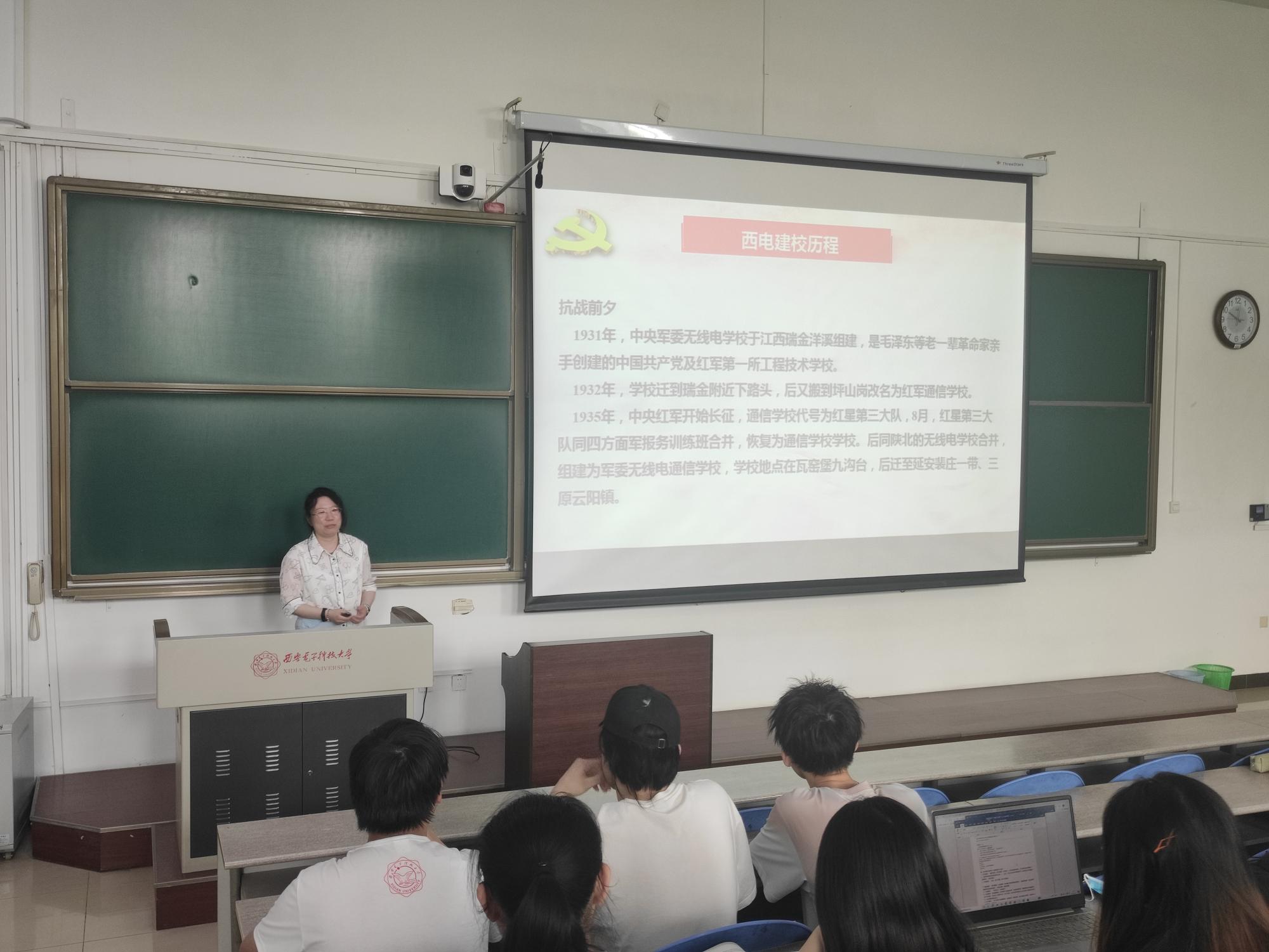 为更好地迎接建党一百周年,时刻谨记先辈们的非凡历程与实践经验,汲取先辈们的革命精神与力量,王璐书记通过党课讲解带领着同学们重温了西电的红色校史。西电由半部电台起家,跟随中央红军在瑞金、延安办学,在枪林弹雨之下对无线电通信技术进行研究与学习,为抗日战场与解放战场输送了数千名通信干部,立下了赫赫战功,让红色的电波传至大江南北。这是一段让每一个西电人都耳熟能详并十分骄傲的历史。除了回顾我校建校历程外,王璐书记还着重强调,希望同学们在学习校史的同时,时刻将毛主席为西电所题的“全心全意为人民服务”铭记于心,担当起一个新时代青年、一个党员应担的责任,全心全意为人民服务,做一名合格的西电人。