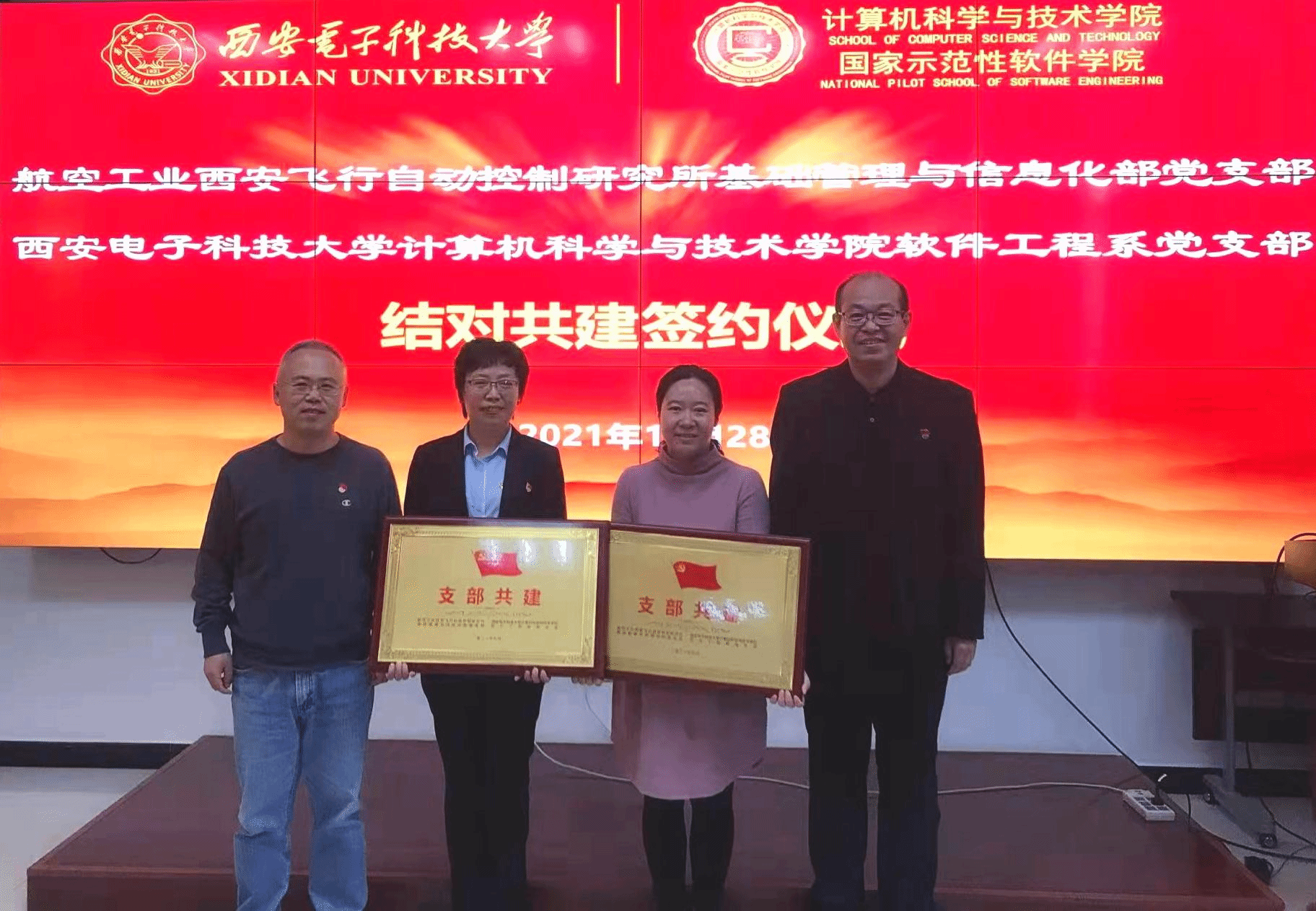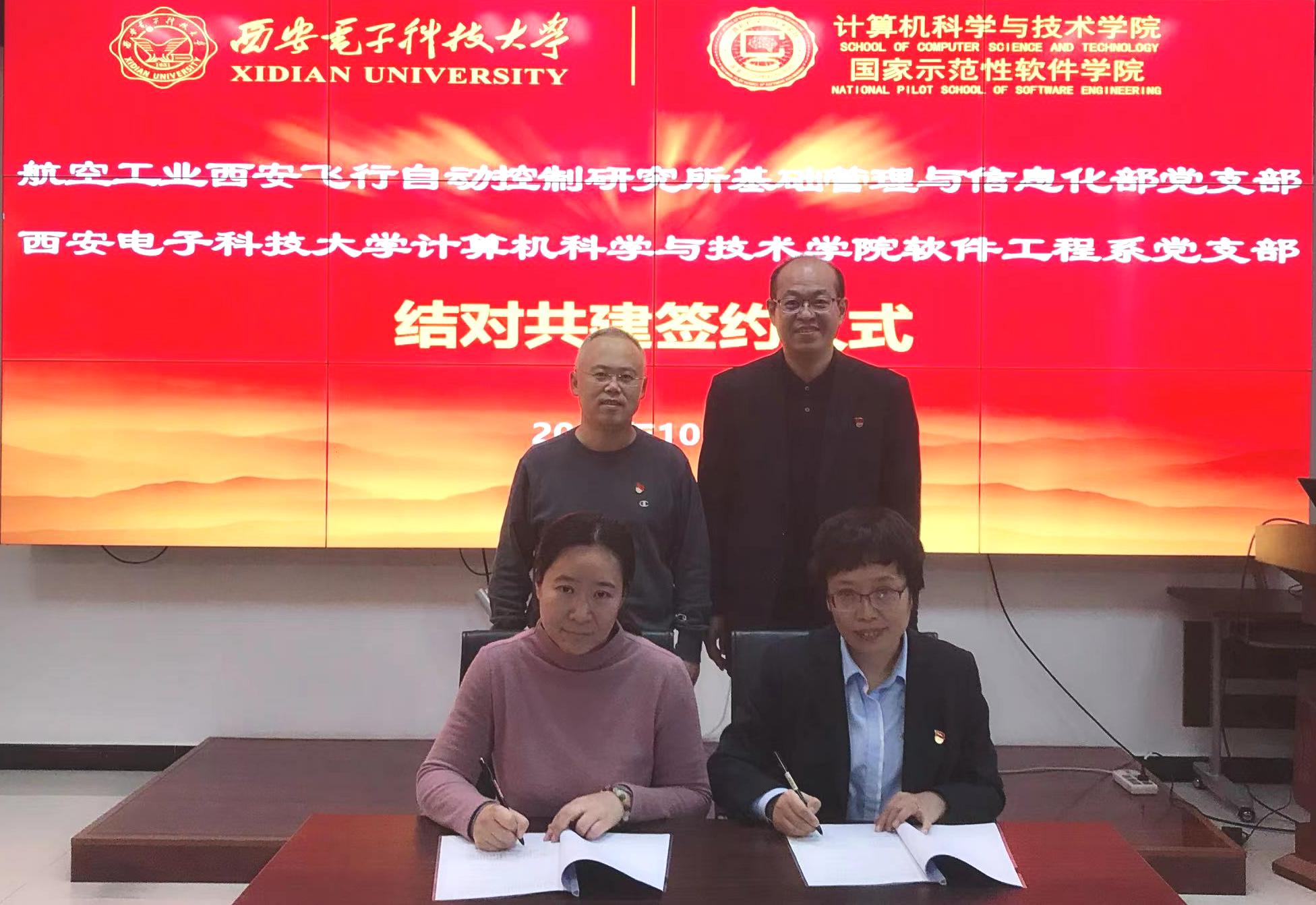 计科院软件工程系党支部书记褚华与自控所基础管理与信息化部党支部书记江梅共同签署了结对共建协议。自控所党委书记王东辉与计科院党委书记李青山分别为结对党支部授牌。
