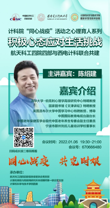 (通讯员 马治东)为帮助我院师生缓解因疫情防控、就业择业、升学毕业而产生的心理压力,进一步提升广大师生的心理调试能力,2022年1月6日晚,kaiyun登录中国入口登录计算机网络与物联网研究所本硕博师第一联合党支部和中国航天科工集团第四研究院第四总体设计部信息保密联合党支部共同策划组织开展了“积极心态应对生活挑战”心理育人报告会,邀请清华大学伯克利心理学高级研究中心特聘教授陈绍建进行专题讲座。航天科工四院四部党委书记周逸,kaiyun登录中国入口登录党委书记李青山、副书记张莹莹出席,200余名学院师生、四院四部职工参加,会议由两个联合共建支部的党支部书记史阿云和张志为共同主持。