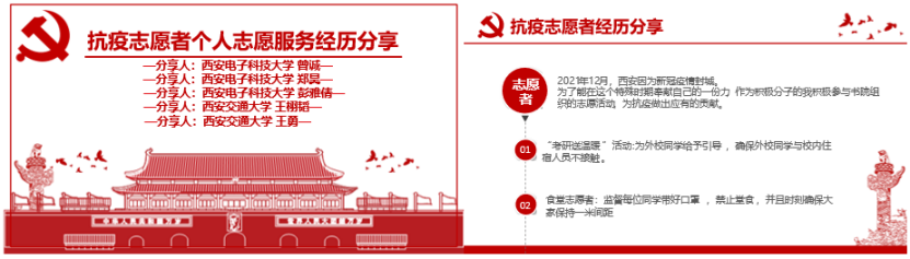然后,西电的甘瑜嘉和西交的佘晓亮分别介绍了两校两院系党支部的抗疫工作情况。西安疫情当前,各高校均采取了严格有效的措施,西电计科院计算理论与技术研究所本硕博师第二联合党支部迅速响应学校和学院党委号召,多名支部党员、入党积极分子加入学院志愿队,担任核酸检测志愿者、出入证志愿者等,以实际行动为同学们服务。西交南洋书院师生联合第三党支部快速响应,迅速发布了有关疫情防控的倡议书,组建书院抗疫志愿先锋队,组织“出入证志愿者、食堂志愿者、核酸检测志愿者”志愿服务队,学院老师、辅导员坚守一线,积极参与,为疫情防控做出贡献!