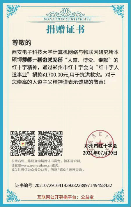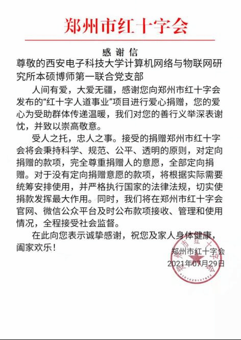 灾情深深牵动着每一个中国人的心,7月24日,kaiyun登录中国入口登录计算机网络与物联网研究所本硕博师第一联合党支部发起“防汛抗洪驰援河南”募捐倡议,倡导大家尽自己所能献出一份爱心,以实际行动支持河南防汛救灾。该倡议得到支部党员们的积极响应,截至日前,计算机网络与物联网研究所本硕博师第一联合党支部共筹集到了1700元善款。该善款已汇至河南省郑州红十字会账户,用于抗洪救灾工作。