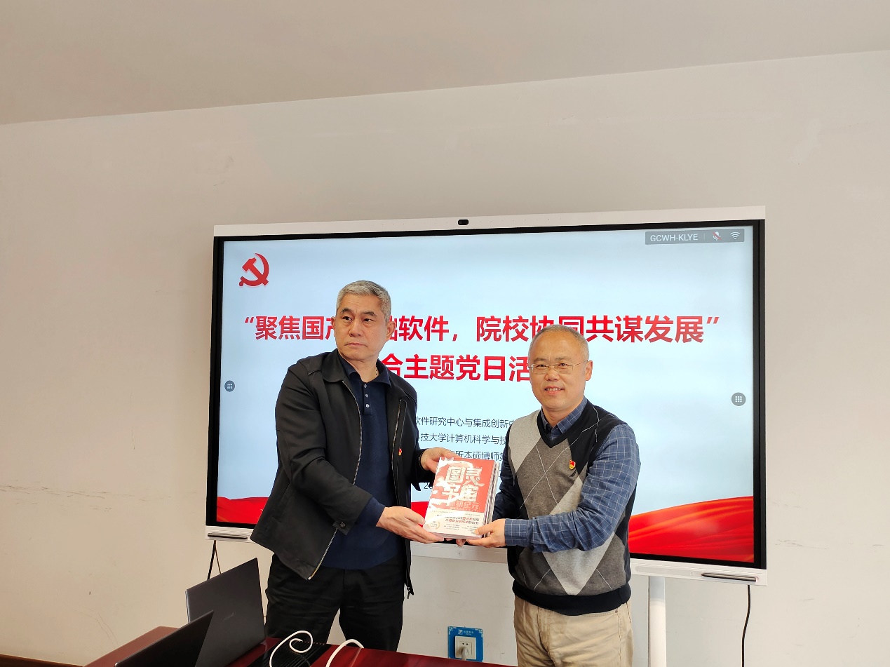 在赠书环节,中科院软件所向西电计科院赠送了支部成员参与编写并出版的《图灵宇宙:原初纪元》、《鸿蒙操作系统应用开发实践》等专业书籍。