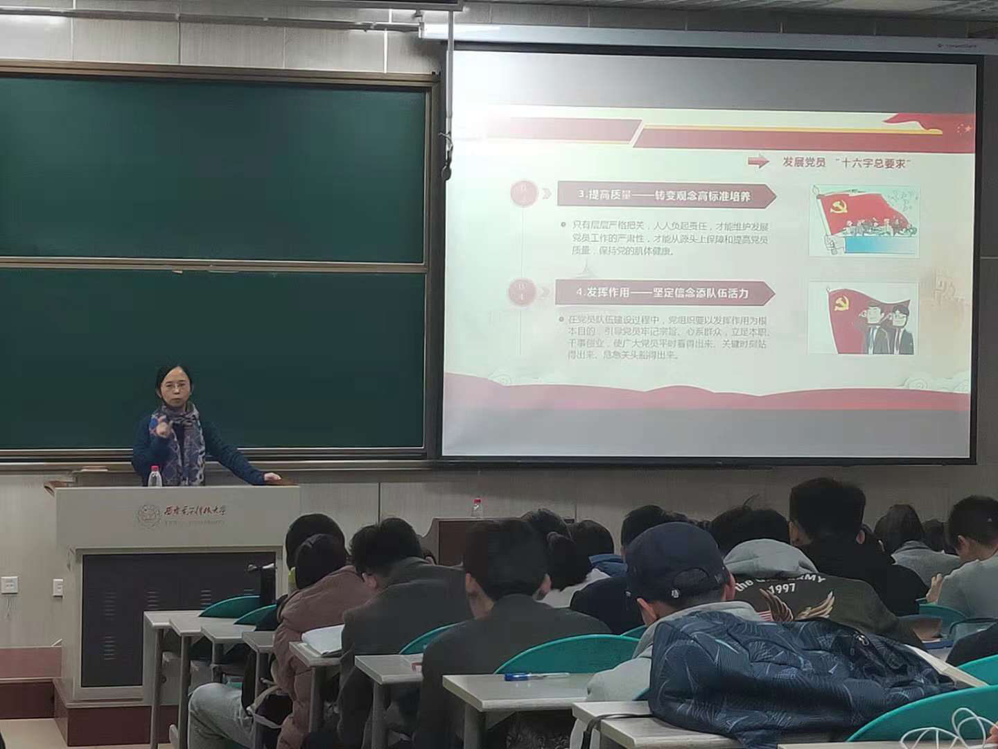 学院党委书记李青山教授、原软件学院党委书记李革建教授、学校党委组织部副部长董大威、学院党委副书记张莹莹为培训班上党课。李青山以《新思想 新使命 新实践》为题,着重对习近平新时代中国特色社会主义思想进行全面解读,阐述了党的伟大成就和时代使命,鼓励同学们立足自身实际,投身党的事业的伟大实践。董大威运用经典实例对党章进行了解读,勉励同学们要在学习理解党的基本理论上下功夫,以党员的标准严格要求自己。李革建从党的十九大的主题“不忘初心、牢记使命”切入,结合我校学科建设、人才培养目标等情况,鼓励大家争做“三有”西电人。张莹莹对党员发展的工作程序和环节进行了详细说明,要求同学们端正入党动机,争取早日入党。