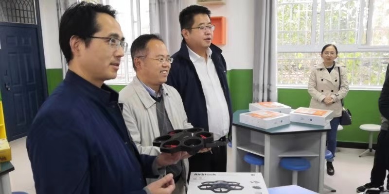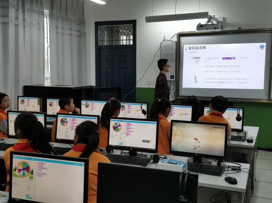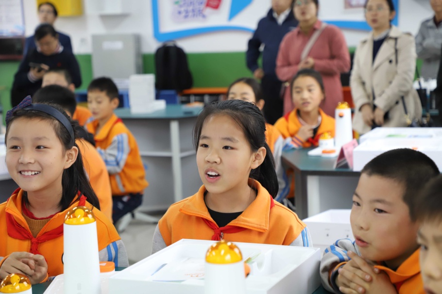 启动仪式后,科创小屋首堂科创课开讲。科创小屋配备了3D打印机、机器战车、无人机等最新的科创课程教具。小学生们首次接触MATA机器人,在科创导师和大学生支教志愿者的指导下,通过简单编程使机器人播放音乐。当机器人成功播放出《我和我的祖国》熟悉的旋律,同学们发出阵阵惊叹。课间西电师生与小学生们积极互动,同学们对科创小屋和高科技的教具充满新奇,提问异常活跃、热情高涨。随后,大学生们还给高年级班级带来了采用基于程小奔教育机器人的模块化编程等精彩内容。
