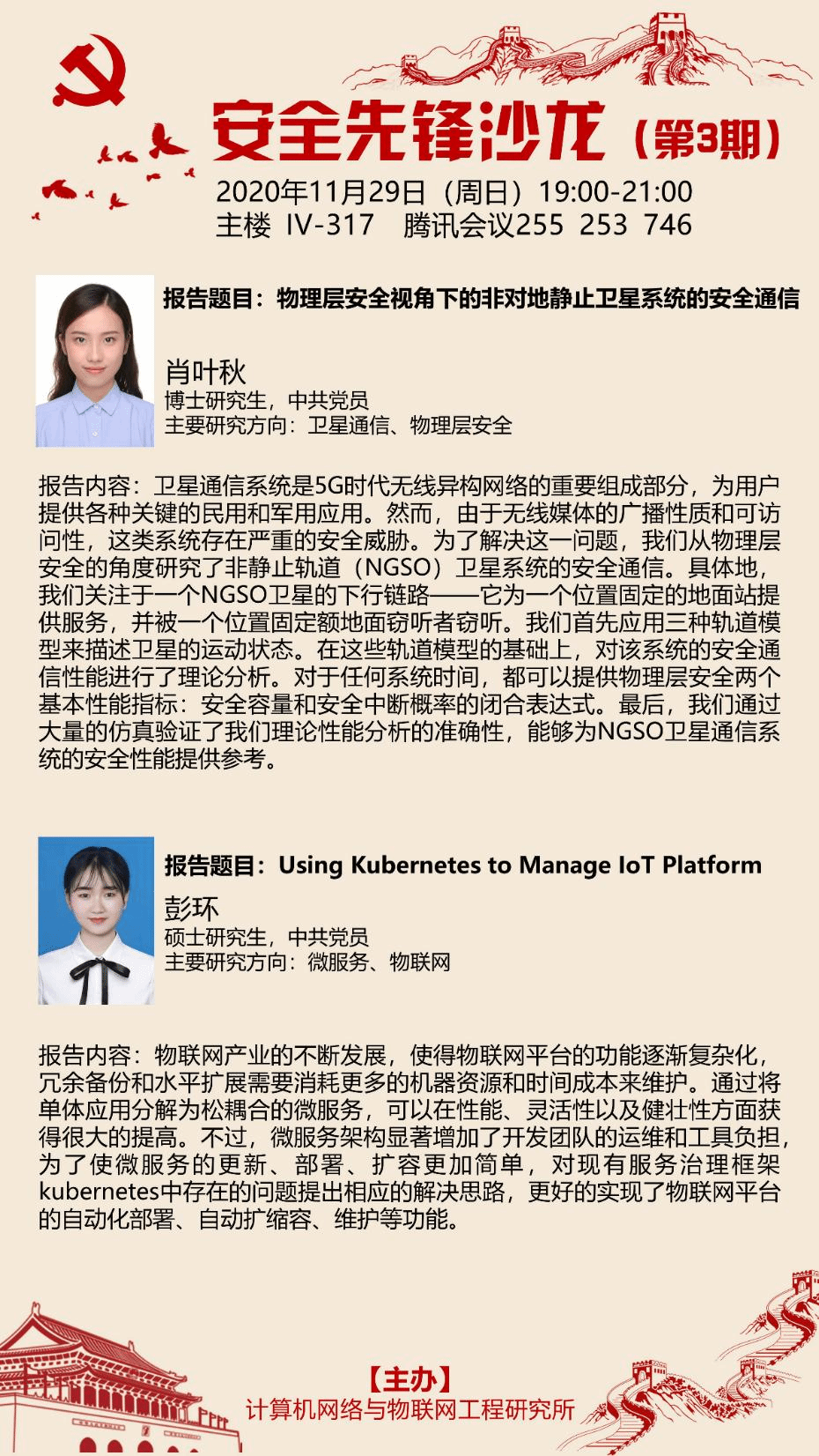 据悉,“安全先锋沙龙”主题报告活动的预期建设效果是在不同培养阶段学生之间搭建起一个学术科研交流的常态化平台,是计算机网络与物联网工程研究所落实三全育人要求,践行“推进党建和业务融合应常态化制度化”的积极探索与实践。活动每两周进行一次,每期组织安排研究所各个方向的博士和硕士研究生分别介绍各自专业领域的理论与技术新进展,欢迎对计算机网络、物联网、云计算及其安全主题感兴趣的师生通过线上或线下的方式参与。