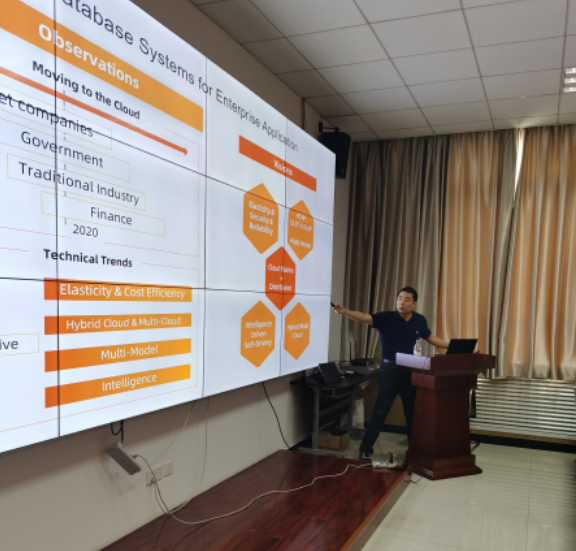 李飞飞教授做了题为《企业级云原生分布式数据库系统:挑战与机遇》的报告。在报告中,李教授为在场师生介绍了阿里巴巴在开发云原生数据库方面所做的各项努力,包括已经成功发布的数据库系统产品和发表在SIGMOD和VLDB等数据库领域顶级会议论文。报告最后,在场师生积极向李教授请教相关学术问题,李教授热情地一一解答。