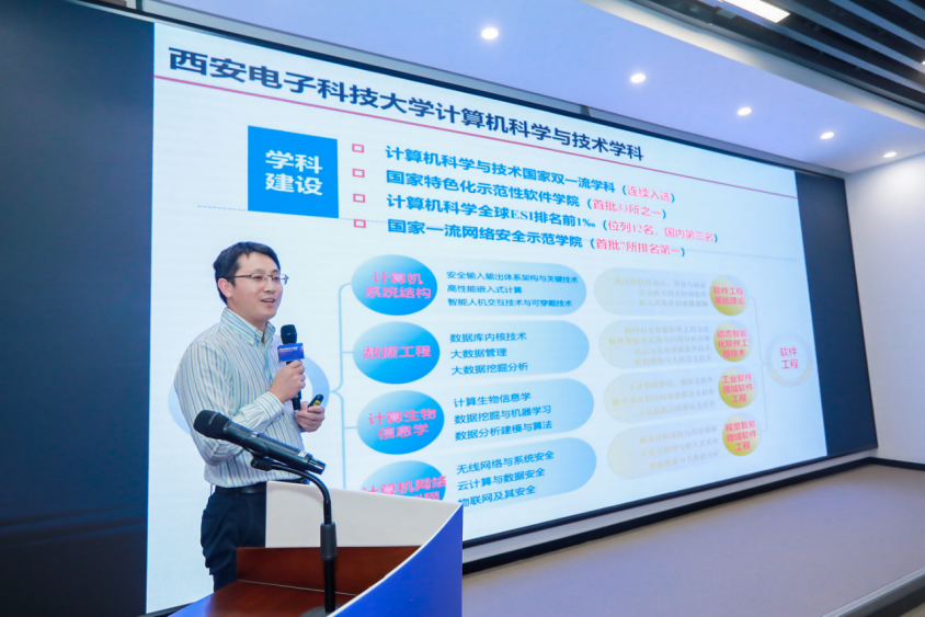 随后,沈玉龙教授与参会企业共同分享了《计算机技术前沿发展趋势》主题报告,并进行了开放应用场景的“揭榜挂帅”,从计算机科学与技术和软件工程两大学科,详细讲解了西电kaiyun登录中国入口登录科学研究内容和技术应用场景。