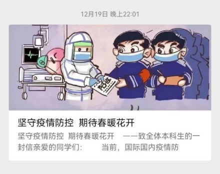 12月18日至19日,学院领导带队,各年级辅导员走进竹园1号书院、丁香1号书院、海棠书院8号楼,一一走访学生宿舍,组织召开师生座谈会,了解学生学习生活情况和思想动态,传达防控要求,回应学生关切。老师们叮嘱同学们安心备考,注意调节心理状态应对学业压力,特别要注意个人身体健康状况,营造宿舍卫生环境,主动配合疫情防控要求。微信公众号及时发布抗疫推文,号召大家行动起来,共同守护师生健康安全和校园稳定。