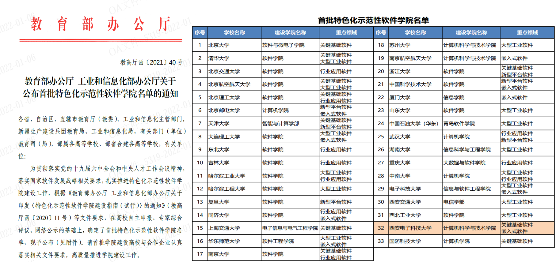 2020年,我校成立了以校领导为组长的特色化示范性软件学院建设领导小组,学院协同校内相关职能部门成立工作组开展建设和申报工作。工作组积极对接各重点领域头部企业,与华为技术有限公司、浪潮集团有限公司和统信软件技术有限公司等知名企业签署联合申报协议。学院以软件工程专业为基础,依托在关键基础软件、嵌入式软件等重点领域的科技创新成果和人才培养优势,与合作企业共同起草了特色化示范性软件学院建设方案和人才培养方案,顺利完成了特色化示范性软件学院的申报工作。教育部、工业和信息化部在高校自主申报、专家综合评议、网络公示基础上,确定了首批33所特色化示范性软件学院建设名单。