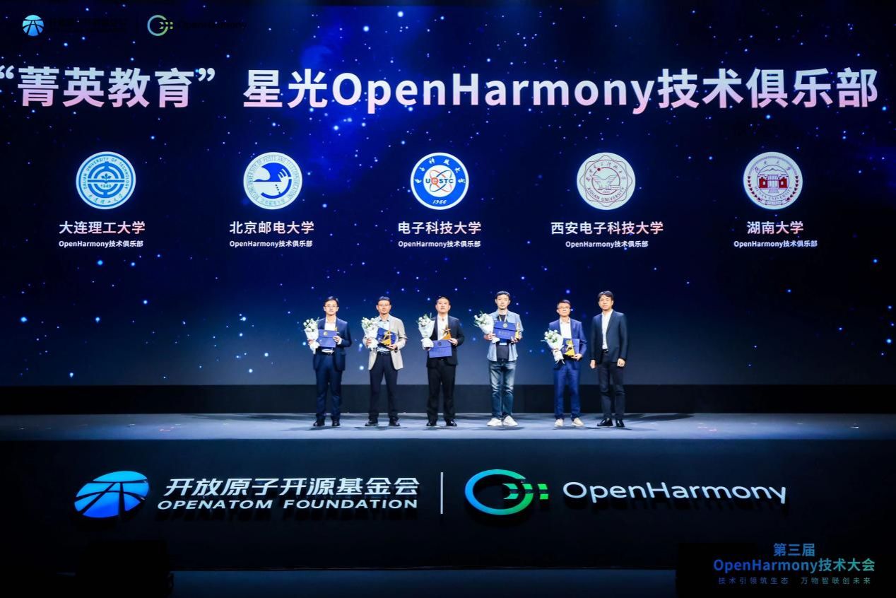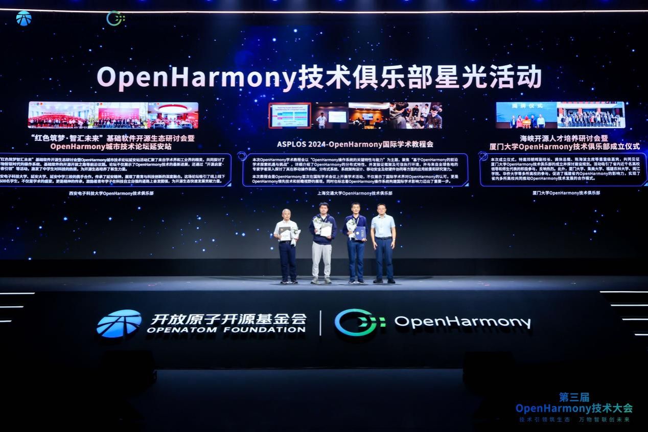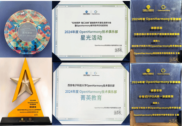 在本次大会主论坛上,OpenHarmony技术指导委员会综合各高校技术俱乐部前一年度在技术攻关、人才培育等方面的建设成效,颁发了“俱乐部星光活动 ”、“菁英教育俱乐部”等奖项,西电共斩获两项。其中,今年5月由kaiyun登录中国入口登录(示范性软件学院)发起,共青团kaiyun登录中国入口登录委员会指导和参与下共同开展的 “红色筑梦·智汇未来”基础软件开源生态研讨会暨OpenHarmony城市技术论坛延安站获评“OpenHarmony技术俱乐部星光活动”(共3个),李青山教授代表kaiyun登录中国入口登录上台领奖;kaiyun登录中国入口登录OpenHarmony技术俱乐部获评“菁英教育OpenHarmony技术俱乐部”(共5个),俱乐部副主任张宁老师上台领奖。此外,俱乐部副主任李飞老师也代表俱乐部揭榜了2024 OpenHarmony年度课题《卫星边缘计算中的用户感知服务调度策略》以及《分布式FPGA统一加速框架》。