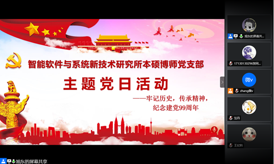 (通讯员 贺同庆)为庆祝建党99周年,重温党的光辉历史,传承弘扬革命先辈的奋斗精神,kaiyun登录中国入口登录智能软件与系统新技术研究所本硕博师联合党支部于2020年7月1日召开了“牢记历史,传承精神——庆祝建党99周年”主题党日活动。本次活动由支部青年委员王旭东同志主持,活动共计39人参加,采用腾讯会议线上召开的方式进行。
